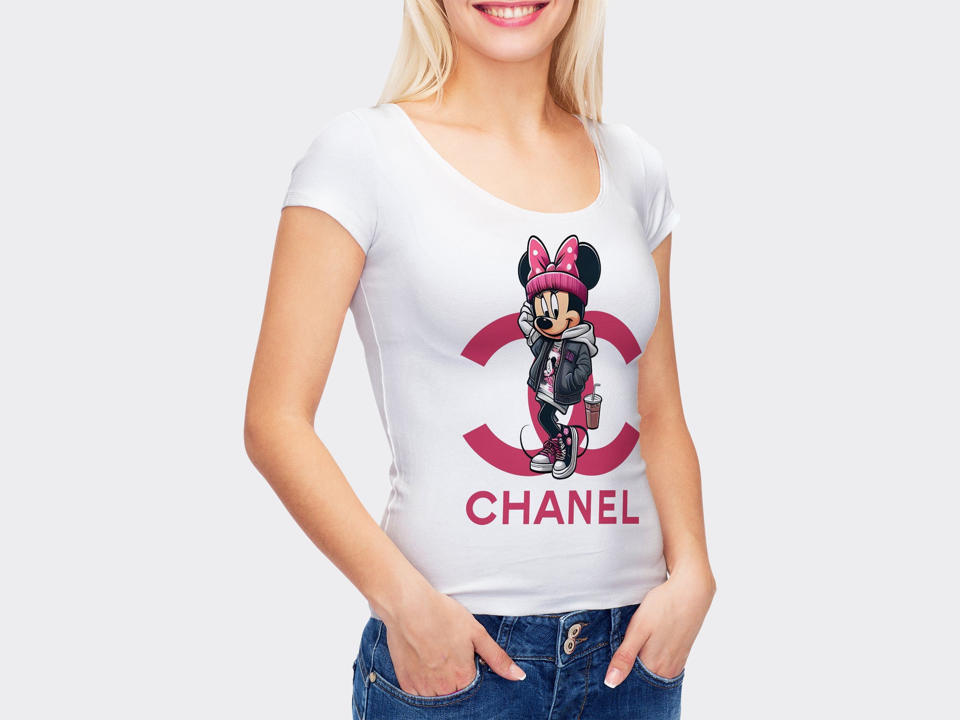 Chanel T-Shirt mit Minnie Mouse. Hergestellt aus schwerer 100% Baumwolle, erhältlich in Schwarz oder Weiß. Weitere Farben sind auf Anfrage erhältlich. Größen reichen von S bis XXL, zusätzliche Größen sind gegen einen kleinen Aufpreis verfügbar. Stilvoll und bequem, perfekt für jeden Disney- und Modebegeisterten!